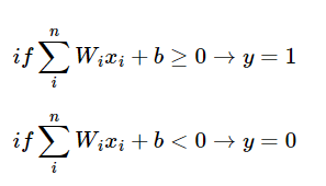 각 입력값이 가중치와 곱해져 인공 뉴런에 보내지고, 각 입력값과 그에 해당 가중치의 곱의 전체 합이 임계치를 넘으면 종착지에 있는 뉴런은 출력 신호로서 1을 출력하고, 그렇지 않을 경우 0을 출력한다.
