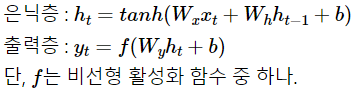 각 메모리 셀은 각 시점마다 input_t와 hidden_state_t를 입력으로 활성화 함수인 하이퍼볼릭탄젠트 함수를 통해 현시점의 hidden_state_t를 계산한다.