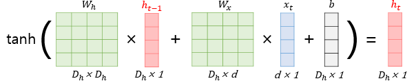 배치 크기가 1이고, d와 D_h 두 값 모두를 4로 가정했을 때 RNN 은닉층 연산을 그림으로 표현하면 아래와 같다.