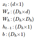 자연어 처리에서 RNN의 입력 x_t는 대부분 단어 벡터로 간주할 수 있는데, 단어 벡터의 차원을 d라고 하고, 은닉 상태의 크기를 D_h라고 할 때 벡터와 행렬의 크기는 다음과 같다.