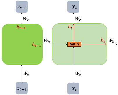 그리고 이를 하이퍼볼릭탄젠트 함수의 입력으로 사용하고 이 값은 은닉층의 출력인 은닉 상태가 된다.