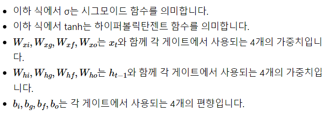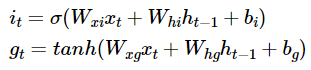 그리고 현재 시점 t의 x값과 입력 게이트로 이어지는 W_xi를 곱한 값과 이전 시점 t-1의 은닉 상태가 입력 게이트로 이어지는 가중치 W_hg를 곱한 값을 더하여 하이퍼볼릭탄젠트 함수를 지난다.