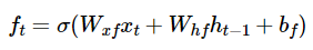 현재 시점 t의 x값과 이전 시점 t-1의 은닉 상태가 시그모이드 함수를 지나 0과 1사이의 값이 나오게 되는데, 이 값이 곧 삭제 과정을 거친 정보의 양이다.