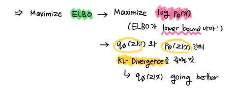 같은 맥락으로 우린 p_theta의 확률분포를 최대화 하기 위해서 ELBO를 최대화 하는 것으로 설정한다.