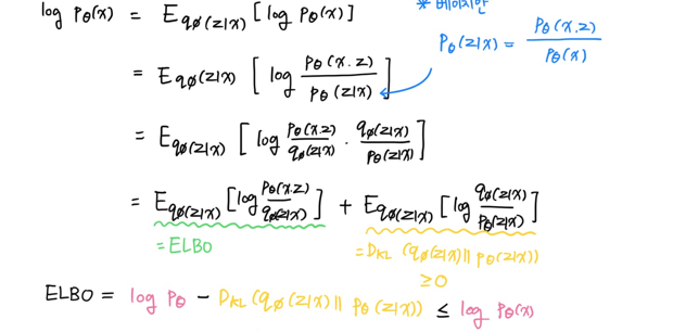 가장먼저 log p_theat(x) = ELBO + D_KL로 나타나져 있다.