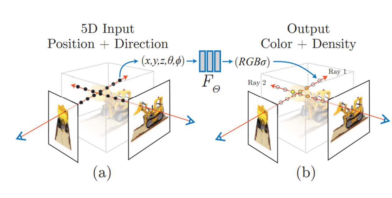 NeRF는 3D location 정보로 (x,y,z)와 2D viewing direction(𝜃,𝜙)를 MLP 모델에 넣어주고 output으로 그 x,y,z 위치에서의 color RGB값과 volume density 𝜎값을 얻게 된다. 이때 나오는 RGB 값과 volume density를 weighted sum을 하여 pixel에 보일 rgb 값을 예측하는 것이다.