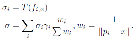포인트 p_K와 mapping된 feature를 f_K라고 할 때 x와 p_K 사이의 상대적인 거리와 feature를 함께 계산하여 새로운 feature f_k,x를 만들어낸다.