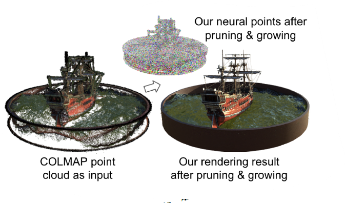 - Uses 3D neural points to model continuous volumetric radiance fields