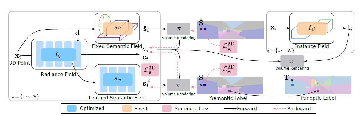 위의 구조 처럼 기존의 NeRF에다가 view independence하게 learned semantic field를 통해 각 point에 대한 semantic segmentation을 진행하는 것이다.