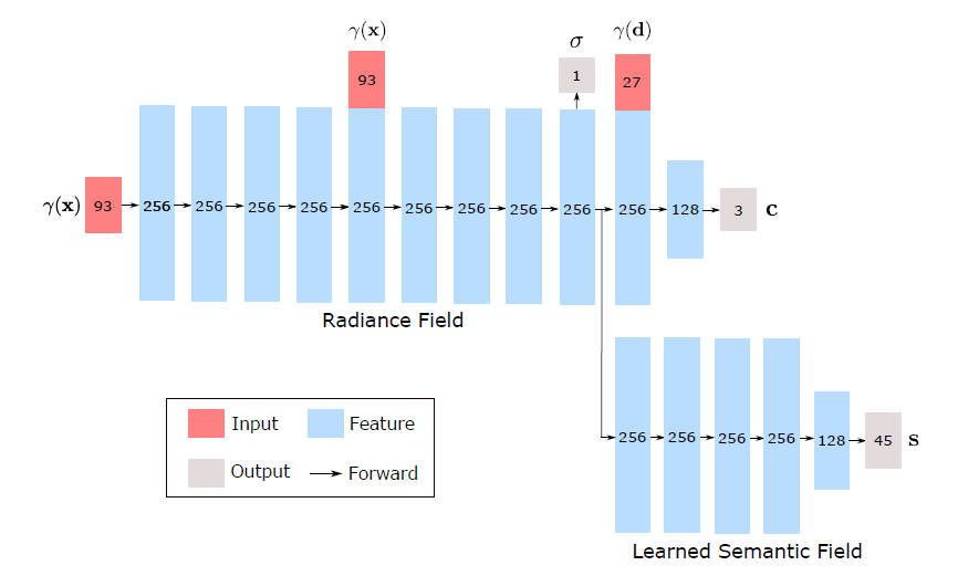 NeRF를 사용한 segmentation을 하기 위해서 NeRF의 구조를 그대로 가져오되, semantci field를 하나 추가하게 된다.