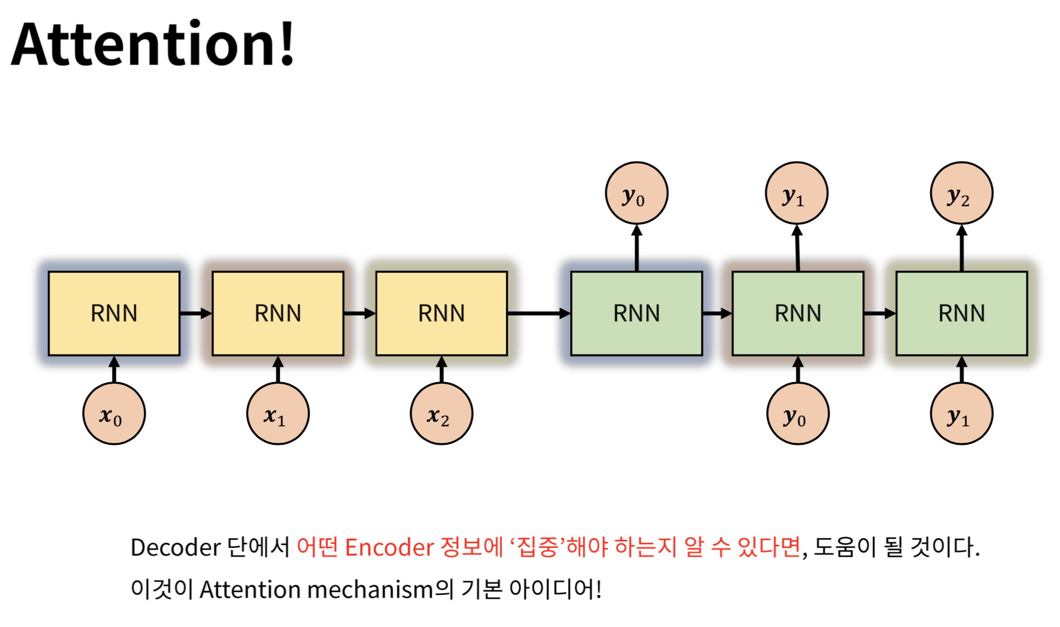 이때 동일한 비율로 참고하는 것이 아니라 해당 시점에서 예측해야할 단어와 연관이 있는 입력 단어 부분을 집중한다.