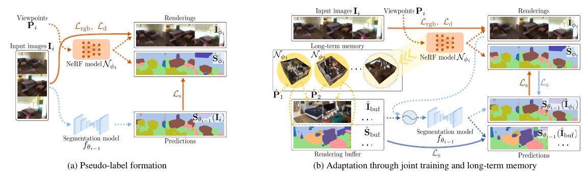 NeRF를 Scene에 대해 훈련을 했다면 이 NeRF자체가 Replay Buffer가 되는 것이다. 이 NeRF를 Buffer로 새로운 데이터를 생성하여 Segmentation model을 학습하고, 또 다시 Segmentation model을 통해 NeRF 모델을 훈련하는 과정을 jointly하게 진행하게 된다.
