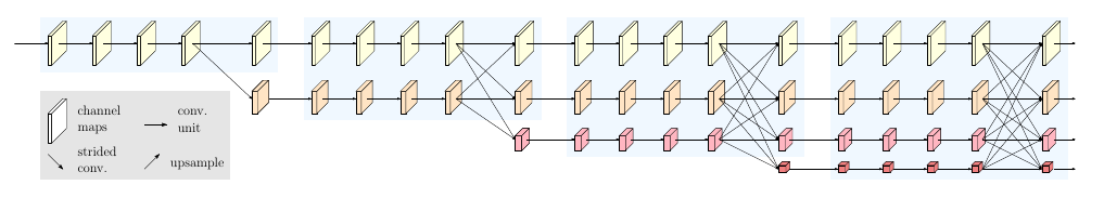 high-to-low convolution을 Parallel하게 만든다. 즉 high resolution을 유지한 상태로 하고 low resolution을 병렬적으로 추가한다고 생각하면 된다(Multi-resolution streams in parallel). 이렇게 할 경우 low resolution을 high resolution으로 올릴 필요도 없고 중간에 각 resolution information 즉 feature을 서로 받기 때문에 정확도도 올릴 수 있다.